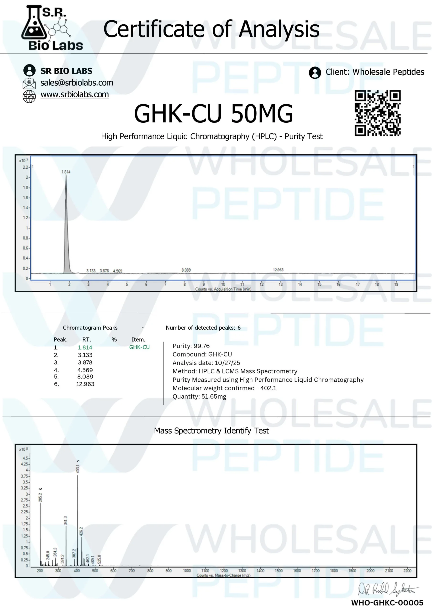 Every batch of GHK-Cu sold by Wholesale Peptide is tested by a third-party using HPLC analysis. This testing verifies both purity and identity so researchers get compounds that meet the specified quality standards for laboratory use.