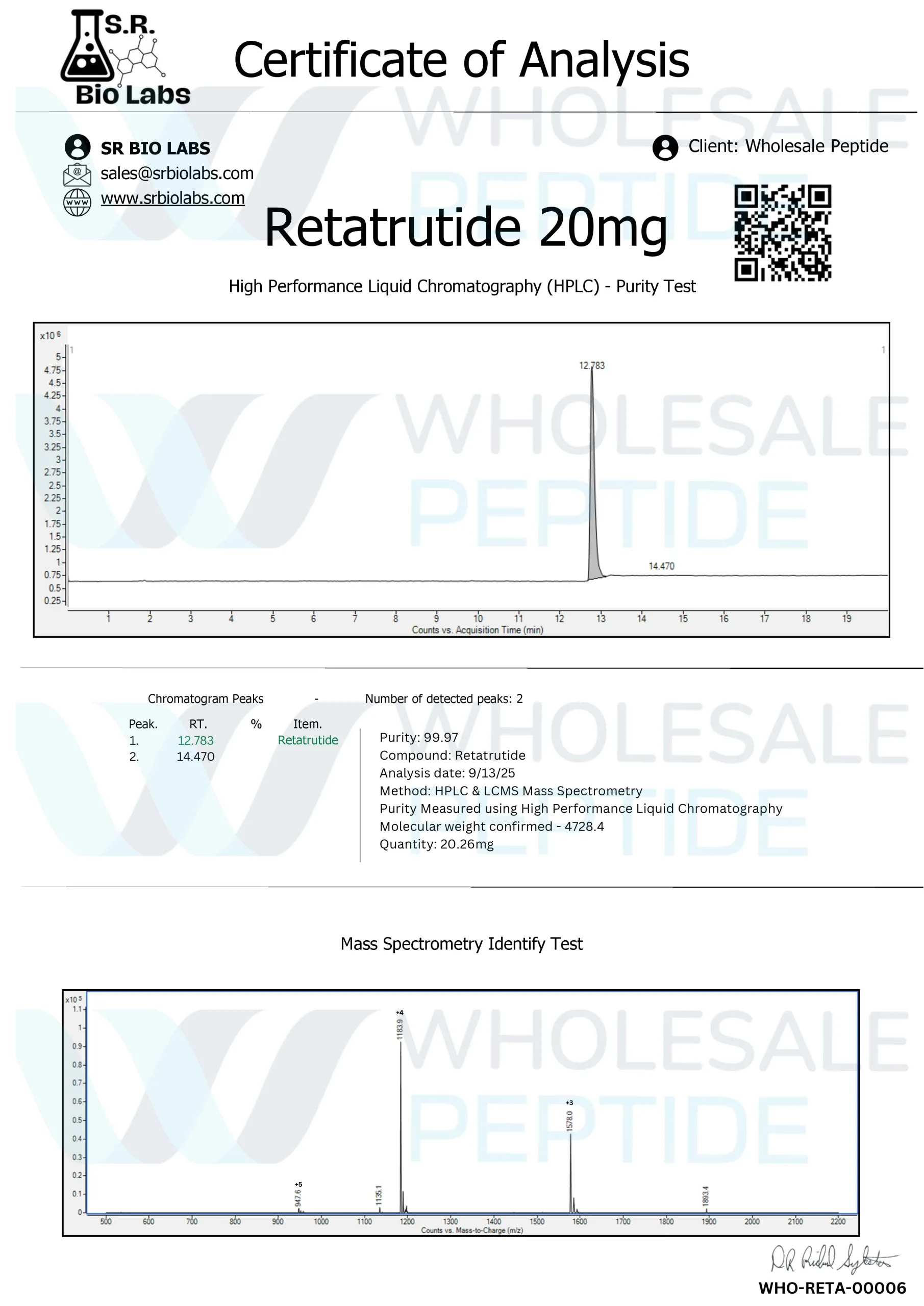 Every batch of products sold by Wholesale Peptide is tested by third party using HPLC to ensure product purity and accuracy.